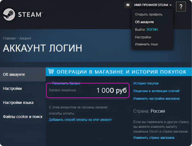 В этом случае цены на внутренние товары Steam будут пересчитываться в валюту аккаунта ($, ₸, € и другие), а не ₽ (рубли). Пожалуйста, учитывайте это при пополнении!