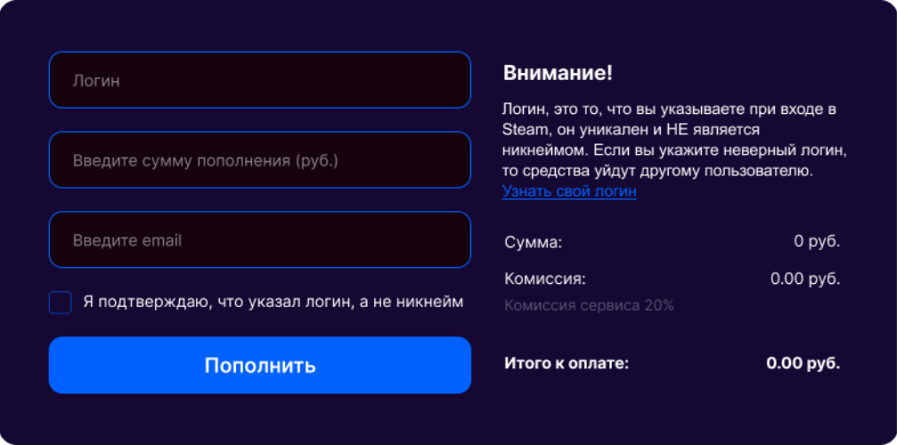 Логин, это то, что вы указываете при входе в Steam, он уникален и НЕ является никнеймом. Если вы укажите неверный логин, то средства уйдут другому пользователю. Узнать свой логин
